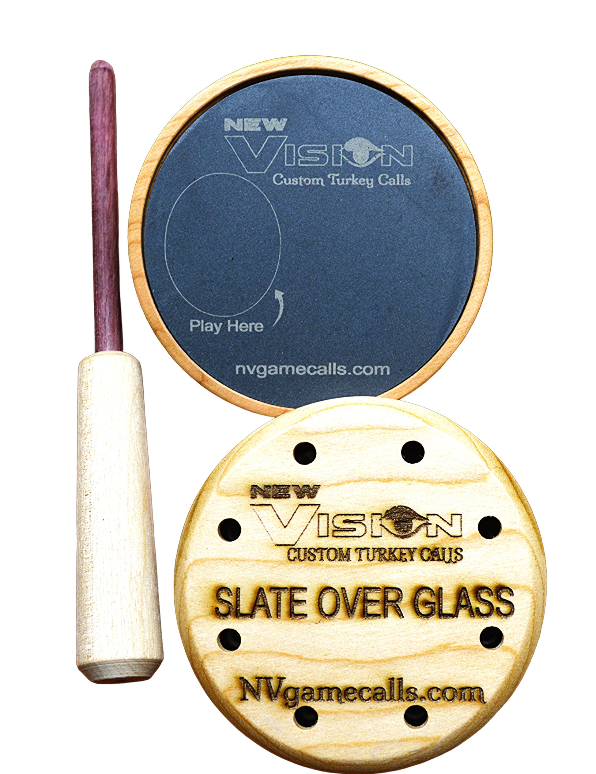 This Single Sided Slate Over Glass Cherry Pot is Custom CNC Routed by myself David Wiegand and Son Cooper Wiegand. This was Call was designed after one of my 1st Ever Slate Turkey Calls. The Inside is not what most would Expect. Each Call is Custom CNC Routed from a Raw Lumber Board shipped in from Missouri here at our Shop Outside of Palestine Texas. Each call we build, WE PERSONALLY TOUCH. NO MASS PRODUCTION GOES ON AROUND HERE. Cherry is one of the best Woods to build a Turkey Call from...Cherry produces truly Unique, Mellow Yelps and Cuts. Combine this with the Slate Surface and a Glass Sound Board.... You have one of the Best all around Go To Turkey Calls you can have in your hand. Each Call is Sanded, Sprayed and Sealed with a Matt Finish Urethane to Reduced Shine to a Weary Turkey. All of our Sound Boards and Surfaces are Press Glue in with our Own Formulated Glue to Ensure a One of a Kind Bond. Each Call we send out is Matched to a Particular Striker when it Goes out. We make sure Each Call that leaves here has what we at New Vision Custom Turkey Calls Strive to Achieve...... Where Precision Meets Nature.
